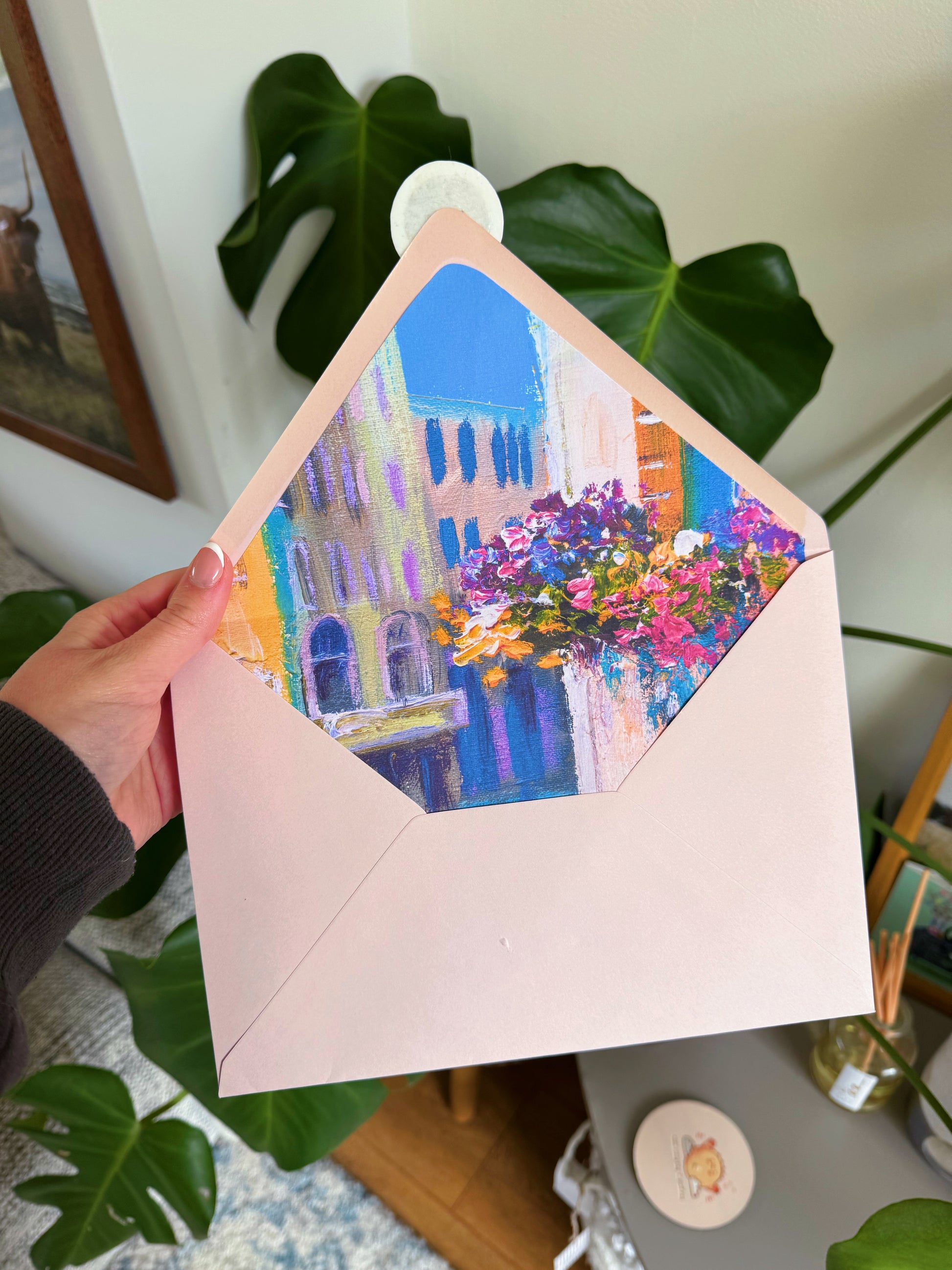 This European Summer-Inspired Pastel Wedding Invitation Suite draws inspiration from a beautiful Venice oil painting. The pastel tones of blue, pink, and yellow add a touch of elegance to your special day. Let your guests experience the romantic essence of a European summer with this beautifully designed invitation suite.